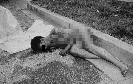 La camiseta y el sujetador de la mujer estaban levantados por encima del pecho, las piernas estaban abiertas, y los brazos extendidos sobre la cabeza. Un agente identificó a la víctima como Mary Lou Pratt, una trabajadora sexual de 33 años.
